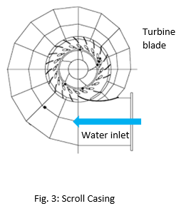 The complete turbine can be covered with a casing with a gradually decreasing cross sectional area along the flow direction. The maximum area is at the junction where penstock delivers the water into the volute/scroll