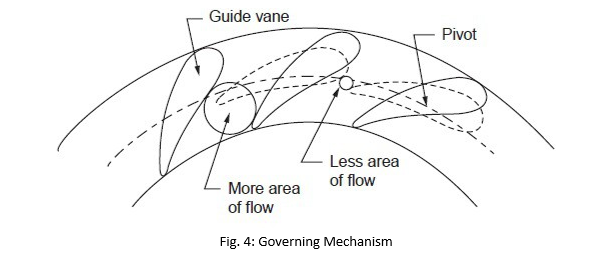 Governing mechanism is used to change the position of the wicket gates to affect in change in water flow rate, depending on the load conditions requirement. It consists of a stationary circular wheel all around the runner of the turbine. The stationary guide vanes are fixed on the guide mechanism where pivoting the guide vanes, the area of the blade passage is increased or decreased to vary the flow rate of water.