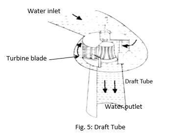 ● The water leaving the runner enters the tailrace after passing through the draft tube which enlarges gradually and the enlarged end is submerged deeply in the tailrace water. Due to this arrangement a suction head is created at the exit of the runner.
