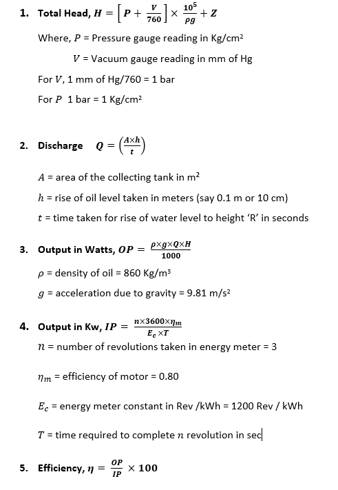 - Repeat the procedure for 1 kg/cm2 incremental by closing the delivery valve gradually, (i.e. 1.0, 1.5, 2.0, 2.5 and 3.0 kg/cm2).