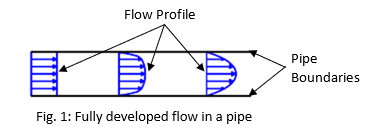 Fluid flow in circular and noncircular pipes is commonly encountered in practice. The hot and cold water that we use in our homes is pumped through pipes. Water in a city is distributed by extensive piping networks. Oil and natural gas are transported hundreds of miles by large pipelines. Fig. 1, the inflow, the velocity profile is often uniform but a thin boundary layer develops on the pipe wall because of friction as the fluid moves along the length of the pipe. Fully developed flow occurs when the viscous effects due to the shear stress between the fluid particles and pipe wall create a fully developed velocity profile. In order for this to occur the fluid must travel through a length of a straight pipe. In addition, the velocity of the fluid for a fully developed flow will be at its fastest at the center line of the pipe. On the other hand, the velocity of the fluid at the walls of the pipe will theoretically be zero. Beyond this distance the velocity profile becomes fully-developed (i.e., doesn’t change any further with downstream distance).