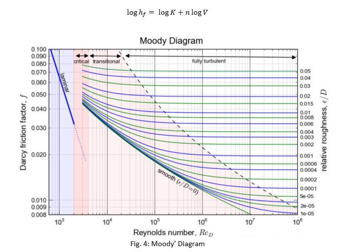 The flow of water, oil, air and gas in pipes is of great importance to engineers. In particular, the design of distribution systems depends on the relationship between discharge, 𝑄, diameter, 𝐷, and available head, ℎ. When a fluid flows through a pipe, there is a drop-in pressure in the fluid, since energy is required to overcome the viscous effects or frictional forces exerted by the inner surface of walls of the pipe on the moving fluid. The losses due to friction are known to as major losses (hf) while losses through fittings, etc., are called minor losses.