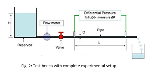 Fig. 2, shows a schematic of test rig or bench for determination of frictional losses in a pipe, who’s each part is explained as follow: