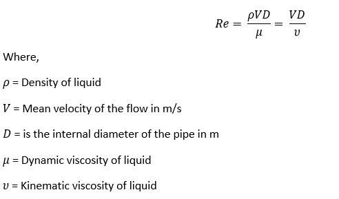 Flow in a pipe is divided mainly into two flow regimes i.e. Laminar and Turbulent flow. The regimes are estimated on the Based on of a dimensionless parameter called the Reynolds number. Reynolds number was named after Osborne Reynolds who demonstrated the occurrence of two regimes of flow in a pipe in the year 1883. Reynolds number is defined as :