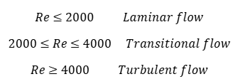 Theoretically it would be nice to have exact values of Reynolds number to define flow regimes for laminar, transitional and turbulent flows but it’s not the case in reality. It is observed that the transition of flow from laminar to turbulent flow depends on many factors i.e. the degree of disturbance of the flow by surface roughness pipe vibrations and fluctuations in the flow. The flow regimes in a circular pipe are taken as: