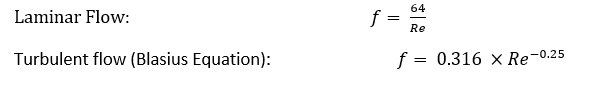 Based on the nature of the flow, friction factor (f) can be estimated using the following correlations :