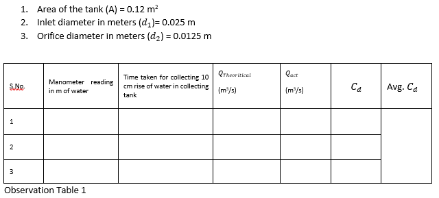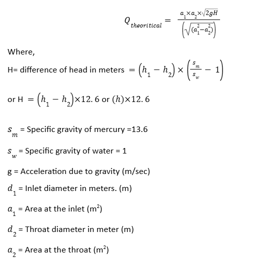 t = Time taken for rise of water level to height ‘R’ in seconds - Using difference in mercury level “h” calculate the theoretical discharge of Orifice meter by using following expression: