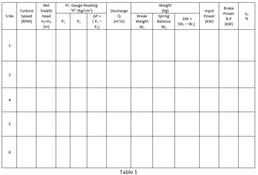 A constant speed is maintained by varying the discharge (by changing spear position) as the load changes. From the measured discharge (Q), head (almost constant), power developed (P) and overall efficiency (ƞo), are calculated and curves are plotted between efficiency (ƞo), power (P) and the discharge (Q).